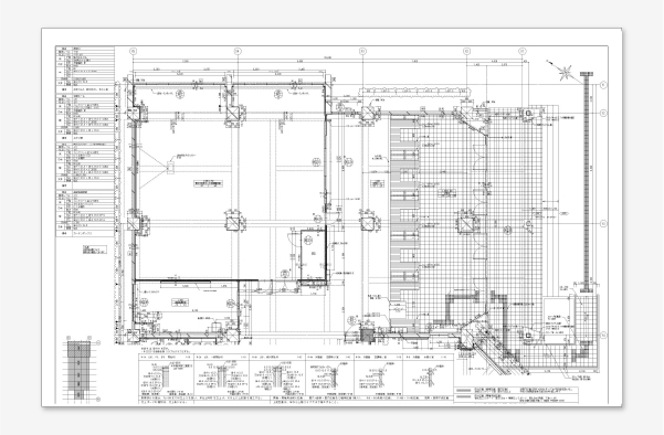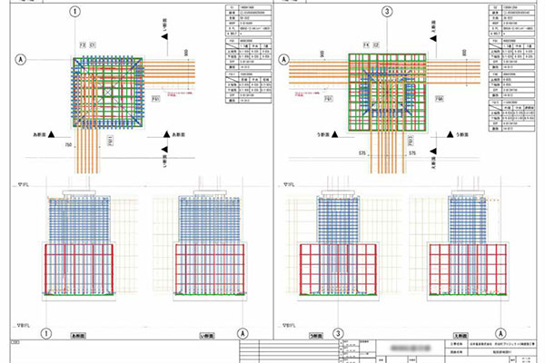 躯体図は、当社の「smartCON Planner R」を使用し、納まりの厳しい部分の配筋検討を行った上で作成します。事前に各種質疑などをやりとりさせていただき、2Dでは気づけなかった部分も解決した躯体図を作成します。
