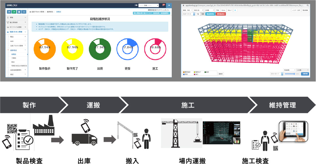 BIMと部材の進捗情報をデータ連携することで、工事工程に沿った製作から運搬、施工、検査まで一元管理し、進捗管理、出来高管理の高度化を可能とするシステム、それがBIMロジスティックスです。