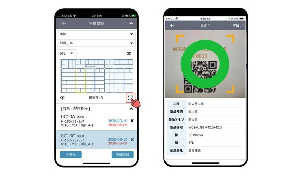 例えば、BIMモデルと連動させた情報をアプリケーション上にアップデートしておくと、搬入時や施工タイミングに、タブレット・スマートフォン上から部材を選択したり、QRコードを読み込むことで、ステータスを登録でき、進捗状況や予定・実績の確認がアプリ上でひと目で出来ます。施工管理の中でも、工程管理や各種の検査などには膨大な時間をかけて資料の作成を行わないといけませんが、このBIMロジスティックスを活用することで、これらをより効率化させることが可能になります。