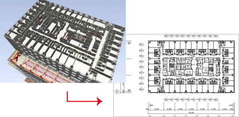 資料が乏しい既存建物や設備配管類などの形も、ありのままに正確に把握し、BIMモデルと重ね合わせての取合い確認や施工計画検討に活用できます。