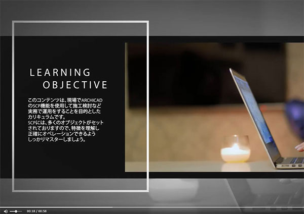 全9キャプチャーでSCP操作や施工計画モデルや施工ステップ作成が学習できます。いつでも、どこでも、何度でも、学習したい項目のみ受講することも可能です。