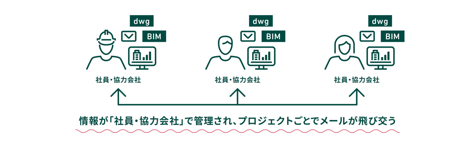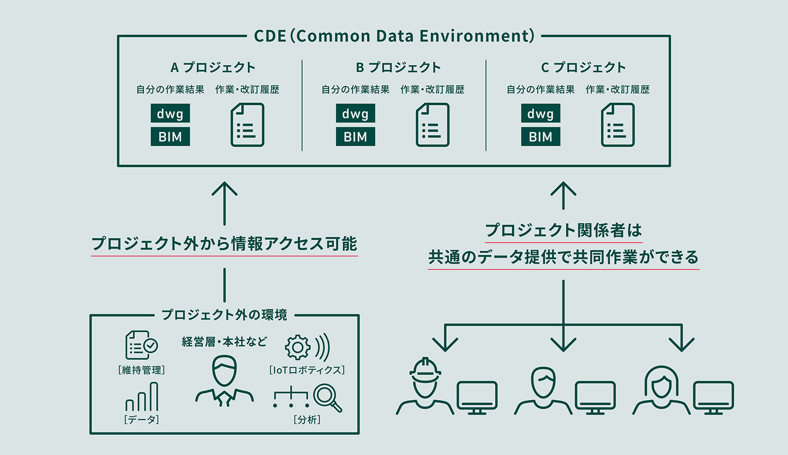 CDEとはCommon Data Environment といい、BIM生産にかかわる 様々なメンバーのワークフロー を改善し、業務効率化と 生産性向上に寄与します。