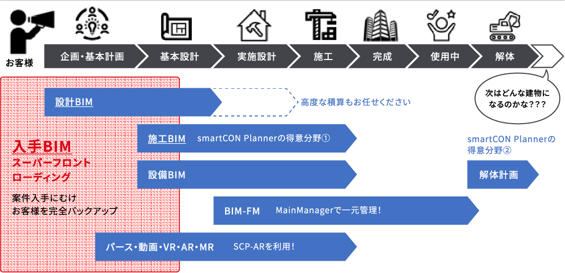 設計と施工のBIMを「連続した活用できる情報」にまとめ、BIM制作を行うことにより「フロントローディング」を実現します。
