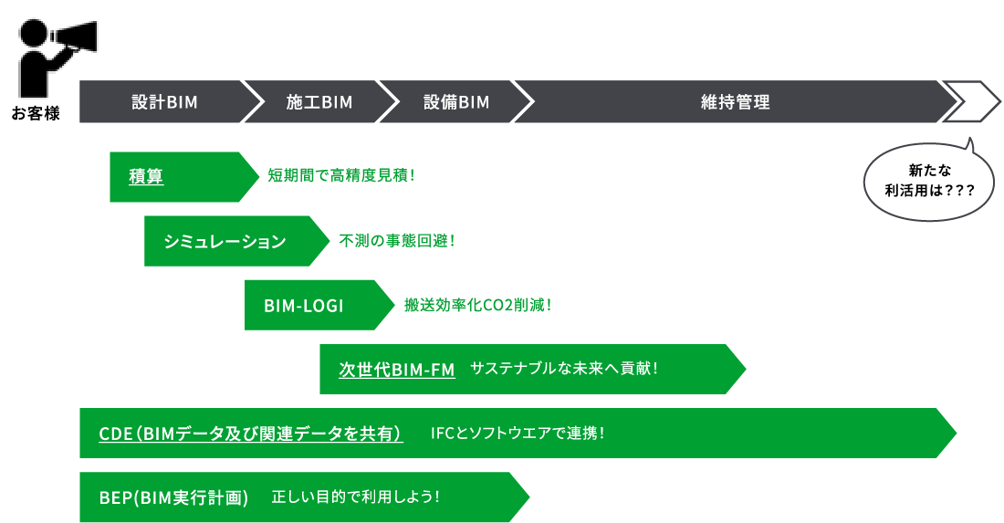 Main Manager(BIM-FM)やBIM-ロジスティックス(物流進捗管理)などはまさにBIMデータ(IFC)の次世代活用といえます。