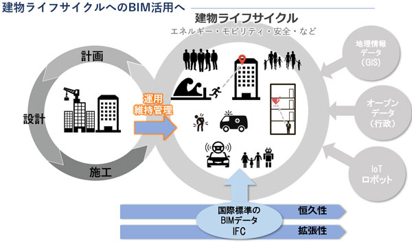 建築時に利用されたデジタルデータの情報は常に活用されBIMデータ国際標準IFCに基づいたオープンなBIM連携プラットフォームを利用し、今後新たに追加されるスマート化サービスや、機器とBIMがAPIを通し連携する仕組みをベンダー依存ではなく、データ(IFC)を中心に考え、多種多様なソフトウェアが参加できるオープンBIMによるBIMデータフローを整合する手法が必要になります。